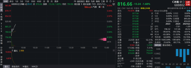 沐曦股份开盘下跌,目前跌1.6%报816元,稍早股价跌破800元。