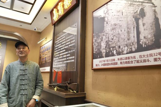 在店内墙上,张贴着电影《建军大业》中朱德设宴桥段的剧照海报,来就餐的客人能直观感受那段风云际会的历史场景。他说,只要大家想听,他和店员都很乐意把这段往事讲给大家听,“能把革命先辈的精神与智慧讲给大家,对我而言既是一份荣幸,也是一种自豪。”