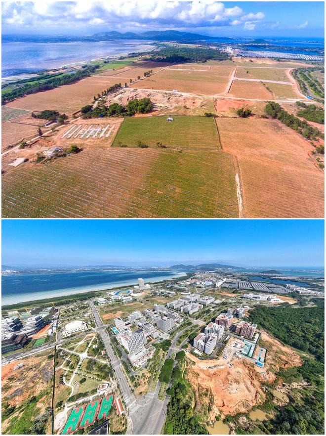 上图:2020年6月18日俯瞰尚未开发的海南陵水黎安国际教育创新试验区所在地;下图:2025年11月22日已初具规模的海南陵水黎安国际教育创新试验区。