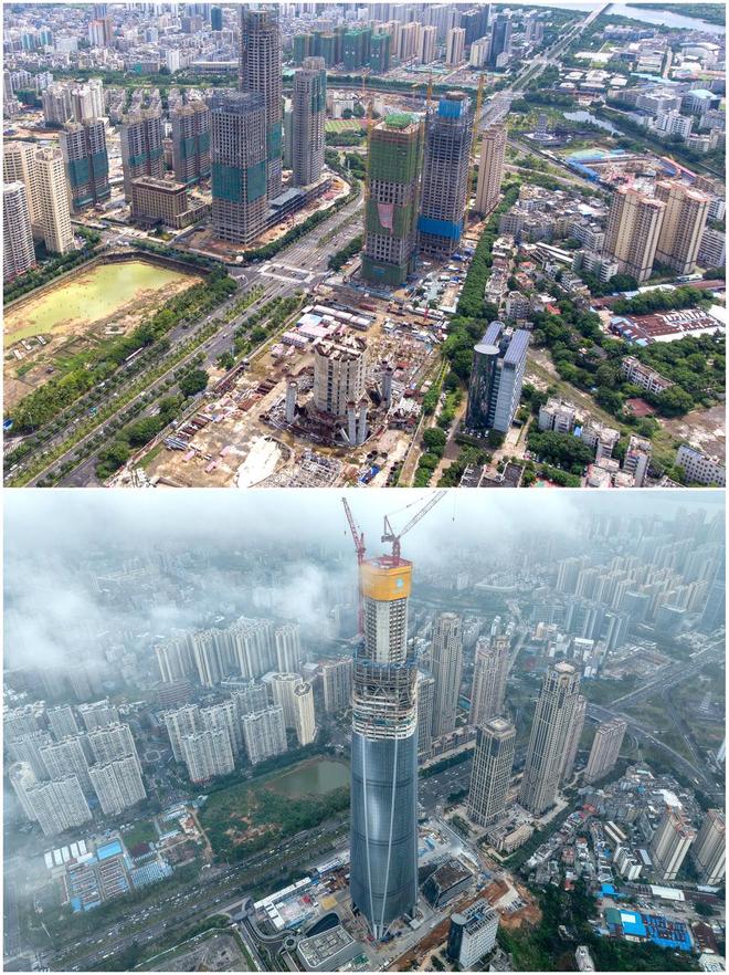 上图:2020年8月21日因故停工的“海南第一高楼”海南中心项目;下图:2025年12月16日海南中心项目顺利完成塔楼核心筒结构封顶。