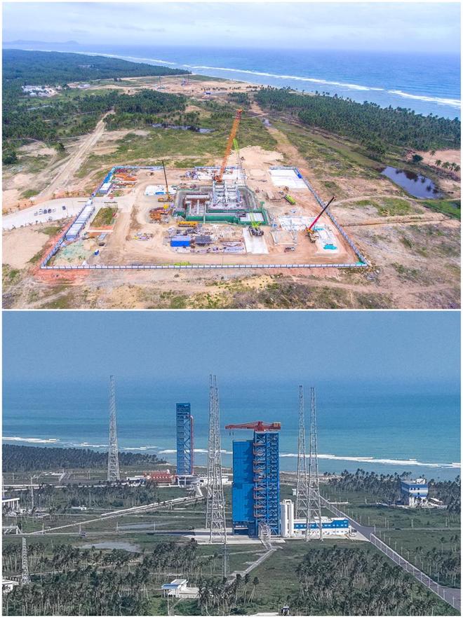 上图:2023年2月1日的海南商业航天发射场一号工位施工现场;下图为2025年12月7日的海南商业航天发射场一、二号工位。