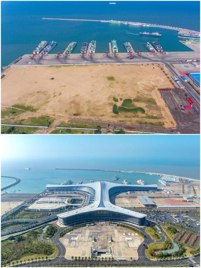 上图:2018年9月29日的海口新海滚装码头客运综合枢纽站项目建设地块;下图:2025年12月5日已投入使用的海口新海滚装码头客运综合枢纽站。