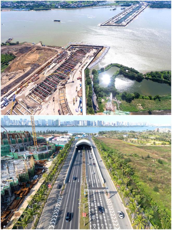 上图:2019年6月19日的海口文明东越江隧道施工现场;下图:2025年12月7日已建成通车的海南省首条跨越南渡江隧道——文明东隧道。