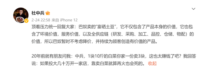 有顾客点了一份售价18元的“富硒土豆”,上桌仅5片。创始人杜中兵回应引发舆论风暴,他先称巴奴卖的土豆营养价值高,是“富硒土豆”,同时提到土豆售价包含了“环境、服务以及全供应链”,不考虑降价。