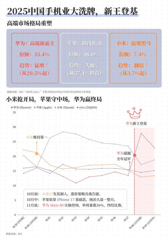 靠着高达95%的国产化率与鸿蒙原生生态的成型,华为彻底收复失地。11月底,Mate 80压轴登场,单周暴涨16%,在W49正式超越苹果,重新加冕中国市场销量冠军。