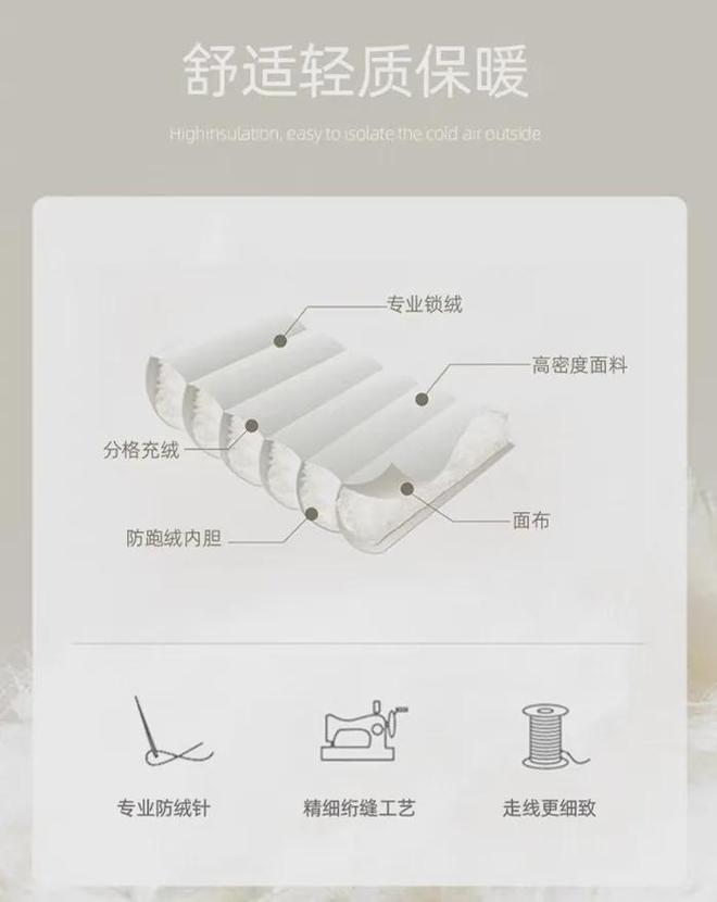 采用高品质90百鹅绒作为纤维里的“尖子生”,拥有着比鸭绒更强的保暖性!