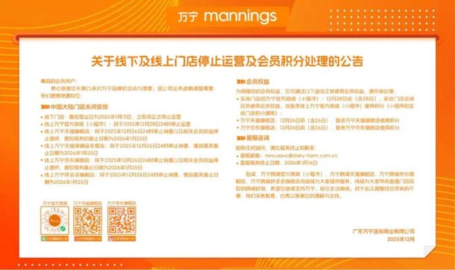 12月15日,据万宁官网消息,因公司业务战略调整,将于2026年1月15日前关闭所有中国内地线下门店。天猫、京东、拼多多等线上电商渠道将于2025年12月26日停止销售,售后服务将持续至2026年1月25日。此后,万宁业务将全面转向线上跨境电商。