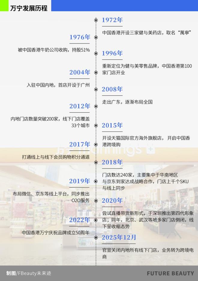 万宁的发展轨迹,与不少跨国零售品牌相似:从初期扩张,到中期徘徊,再到最终收缩。品牌起源可追溯至1972年的中国香港,最初为"健与美"药店,后被牛奶公司收购,逐步成长为区域性知名连锁。