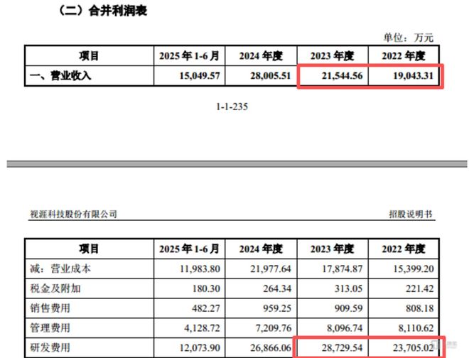2022年-2024年和2025年1-6月(下称“报告期”),视涯科技分别实现营业收入19043.31万元、21544.56万元、28005.51万元、15049.57万元,呈现持续增长态势,但这一业绩表现并未达到科创板上市的营收评判标准,科创板要求最近三年营收复合增长率≥25%或最近一年营业收入≥3亿元,而视涯科技2022-2024年营收复合增长率仅为21.27%,2024年营收也仅为2.8亿元,两项指标均未达标。