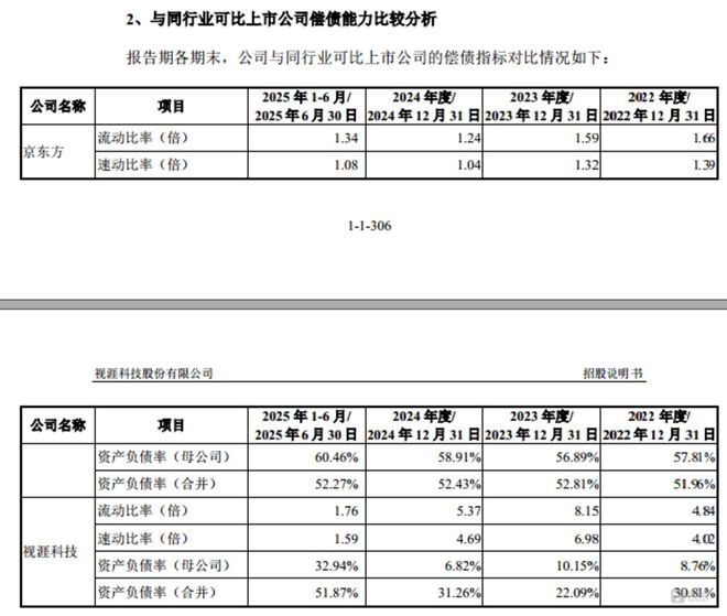 从债务结构与偿债能力来看,,视涯科技在申报稿中仅列举了京东方为公司的可比公司,报告期内,视涯科技的流动比率分别为4.84、8.15、5.37、1.76,京东方的分别为1.66、1.59、1.24、1.34;速动比率分别为4.02、6.98、4.69、1.59,京东方的分别为1.39、1.32、1.04、1.08;资产负债率分别为30.81%、22.09%、31.26%、51.87%,京东方的分别为57.81%、56.89%、58.91%、60.46%。视涯科技的无论是流动比率还是速动比率均始终远高于京东方,且资产负债率也是低于京东方,展现出极强的偿债能力。在自身资金充裕、手握大额理财资产且债务压力远低于同行的背景下,视涯科技仍计划通过IPO募集20.15亿元资金,其募资必要性缺乏合理的财务逻辑支撑,亟待公司进一步解释。(文 | 公司观察,作者 | 邓皓天,编辑 | 曹晟源)