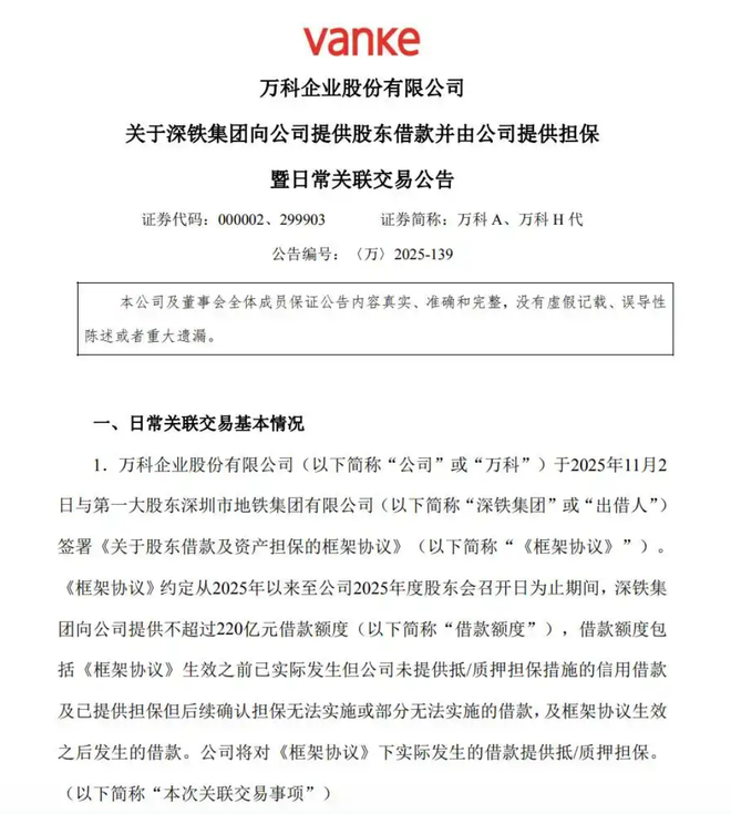 然而,这种支持绝非无限。11月,万科通过了一份关于股东借款框架协议的议案,根据议案,自2025年起至万科2025年度股东大会召开之日为止,深圳地铁将向万科提供最高220亿元的借款额度。
