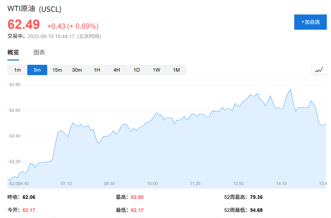 - 西德克萨斯中质原油上涨 0.69% 至每桶 62.49美元。