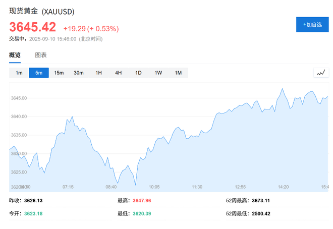 现货黄金涨0.53%,报3645.42美元/盎司。