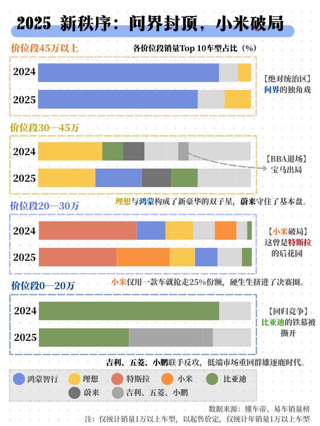 旧秩序正在崩塌中重塑: 问界在豪车市场对BBA完成了实质性清场,小米仅凭单一爆品就切走20-30万级市场四分之一的蛋糕。而在国内红海之外,出海已成必选项,比亚迪海外销量翻倍式暴涨,新势力更是直接将工厂与资本投向全球。