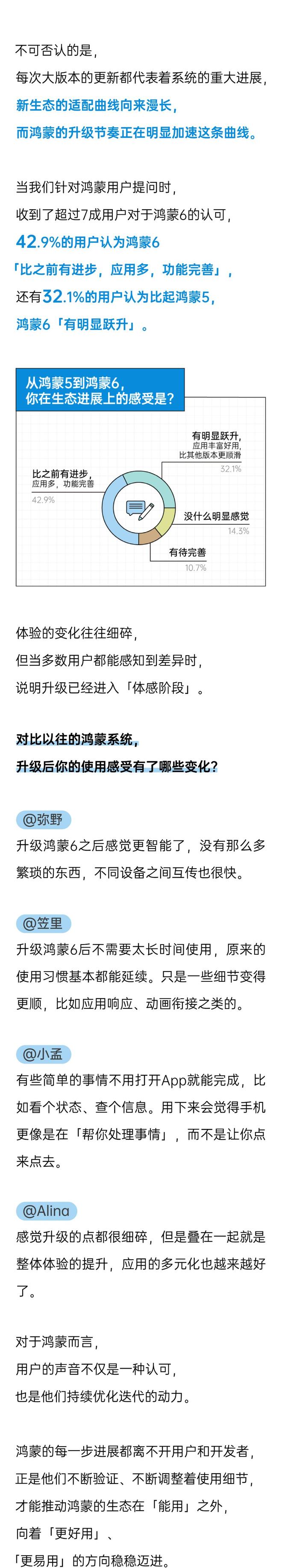 鸿蒙生态正在用越来越丰富、越来越完整的应用生态,回应这届用户越来越细致的体验标准。未来会如何,我们都没有标准答案,但可以确定的是,鸿蒙系统及生态具备持续进化的能力,这两年间,生态体验上的巨大跃升,已经证明了它正向成长的发展潜力:用户的体验反馈、期待将不断推动着生态的迭代和创新,鸿蒙和生态伙伴携手将为这届年轻人带来更多新鲜的App体验!