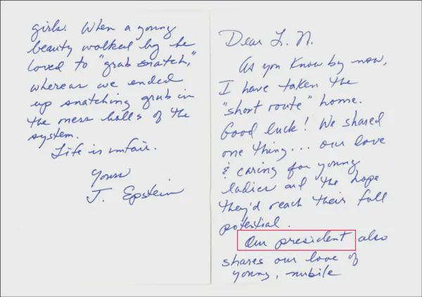 爱泼斯坦还写道:“亲爱的L.N.(拉里・纳萨尔缩写):想必你现在已经知道,我已选择‘捷径’回家(指自杀)。祝你好运!我们有一个共同点…… 我们都‘关爱’年轻女性,并希望她们能充分发挥自身潜力。”