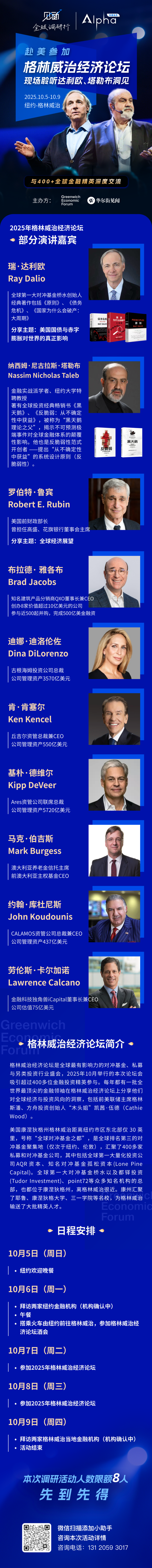 我们诚挚邀请你在10月5日至9日,与我们一起赴美参与2025年格林威治经济论坛,去现场聆听瑞·达利欧、塔勒布、美国前财长鲁宾以及众多全球资管巨头、顶级对冲基金掌门人对经济与资本市场走向的推演与预判。