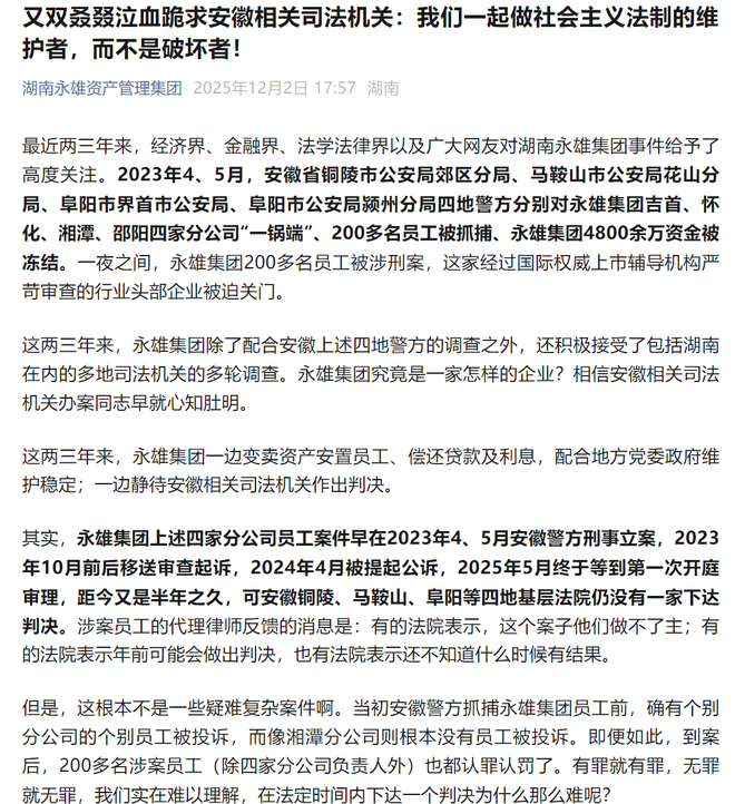 更大的打击来自2023年4月和5月,当时安徽警方跨省执法,相继介入永雄集团四家分公司调查,将200多名员工强制带往安徽,并采取刑事强制措施。