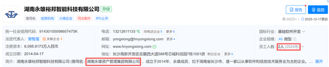 公司高峰时期的1.7万名员工,到2024年仅剩三十余人。集团更名后的湖南永雄裕邦智能科技有限公司,参保人数从2022年的3205人锐减至2024年的2人。