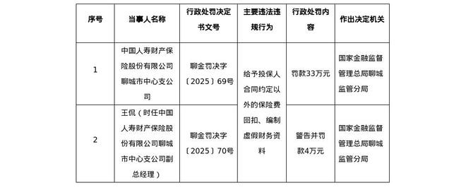 人寿财险聊城中支遭罚33万,责任人被罚款4万