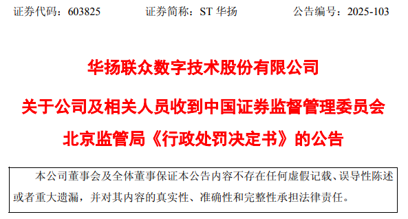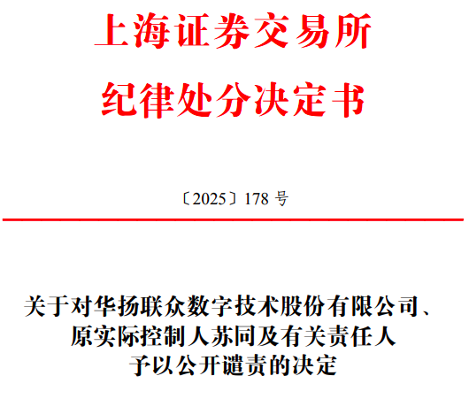 9月10日晚间,华扬联众数字技术股份有限公司(证券简称:ST华扬,证券代码:603825)公告,公司于当日收到北京证监局《行政处罚决定书》,公司及前实控人苏同等2人合计被罚1450万元。同日,上交所对公司、原实际控制人苏同及有关责任人予以公开谴责。