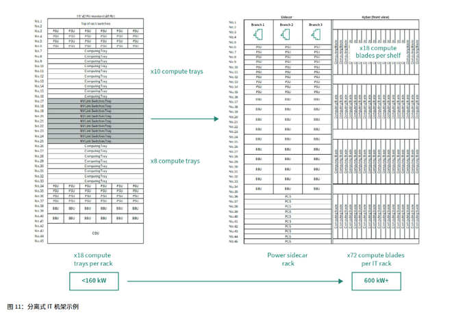 在如此高功率水平下,机架内部空间成为主要物理限制。AI机架将更专注于IT负载与高速通信功能,电源模块、电池备用储能单元等附加功能将迁移至侧柜或辅助机架。