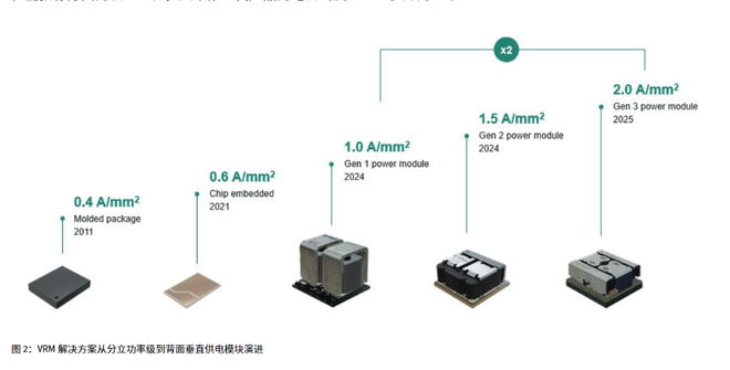英飞凌提供从分立功率级到四相垂直功率模块的完整产品组合,第三代产品电流密度已达2A/mm²。公司将OptiMOS™ 7系列低压硅基MOSFET技术与芯片嵌入封装技术及专利3D集成工艺相结合,在垂直供电方案中实现前所未有的功率密度。