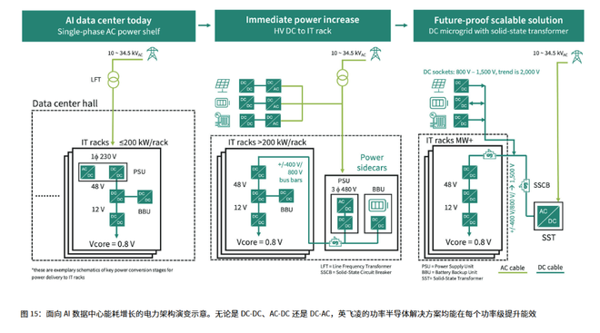 固态变压器(SST)技术将发挥关键作用,能够直接从10kV-35kV中压交流电网接收电能,提供稳定可调的高压直流配电。每台固态变压器输出功率预计可达2-10兆瓦。英飞凌为此类应用提供广博的CoolSiC™ MOSFET和IGBT产品组合(电压范围覆盖750V-3300V)。