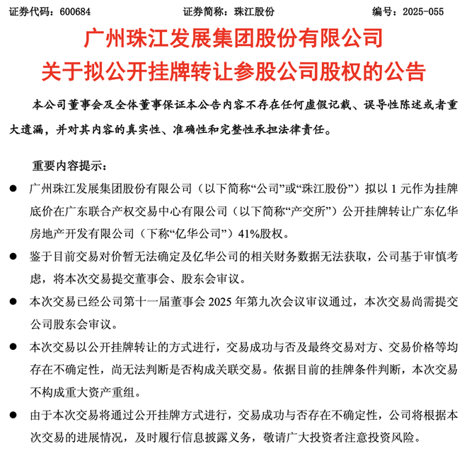 9月10日晚间,珠江股份(600684)发布公告,拟以1元作为挂牌底价在广东联合产权交易中心公开挂牌转让公司持有的广东亿华房地产开发有限公司41%股权。