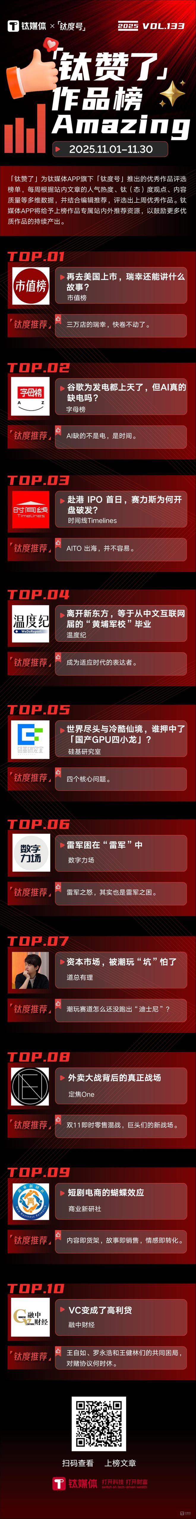 2025年11月1日—2025年11月30日,「钛赞了」榜单第133期上榜作品为: