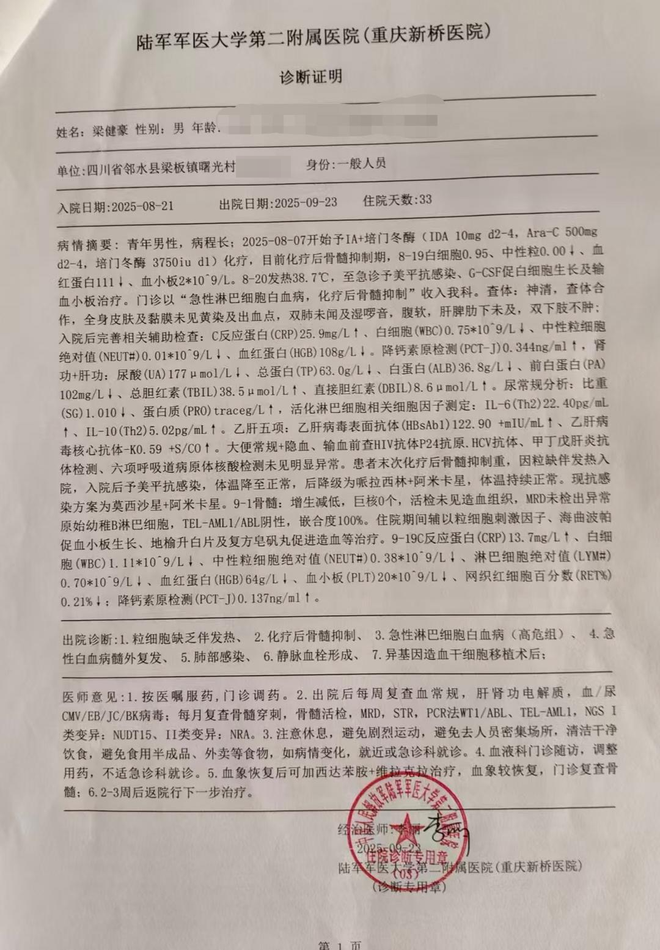此后,家人带着梁健豪辗转多家医院检查,病因依旧未能明确。而他的肚子因肝肿大一天天隆起,疼痛也在持续加剧。为了寻求更精准的诊治,家人带他赶赴重庆新桥医院。经过骨髓穿刺等一系列检查,梁健豪最终被确诊为急性淋巴细胞白血病,彼时的他,正在读高二下学期。