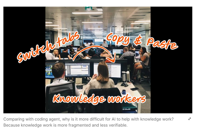 首先是上下文碎片化(Context Fragmentation)。对于编程而言,工具和上下文往往集中在一处:IDE、代码库、终端。但通用知识工作分散于数十种工具中。设想一个AI智能体试图起草一份产品简报:它需要从Slack讨论串、战略文档、上季度数据面板中的指标,以及仅存于某人脑海中的组织记忆中提取信息。今天,人类仍是粘合剂,通过复制粘贴和在浏览器标签页之间切换来拼合所有信息。除非这些上下文被整合,否则智能体将受困于狭窄的应用场景。