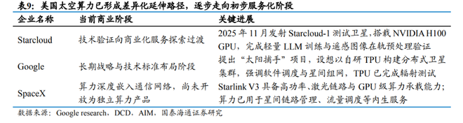 在美国市场,太空算力的发展呈现出鲜明的巨头主导特征。报告指出:“全球龙头主导的太空算力的早期探索与能力构建,正在逐步形成大规模商业化扩散。”
