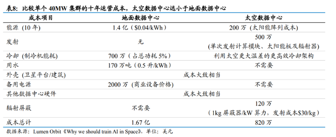 根据Lumen Orbit白皮书测算,一个40MW数据中心集群十年的能源成本,地面需1.4亿美元,而太空仅需200万美元(太阳能阵列成本)。 这种成本结构的根本性改变,使得太空算力具备了压倒性的长期经济优势。在这方面,地面与太空的能源成本比例约为70比1。