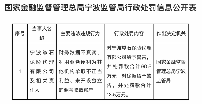 其中,对宁波岑石保险代理有限公司给予警告,并处罚款合计60.5万元;对徐振给予警告,并处罚款合计13.5万元。