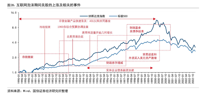 研报表示,回顾历史,互联网泡沫并非单纯的产业狂欢,而是特殊时代背景下资金与资产供需失衡的产物。彼时,美国正处于冷战结束后的“和平红利”期,财政盈余导致美债供应大幅减少,形成了严重的“资产荒”。与此同时,存款搬家与养老金制度改革(401k)促使非银金融爆发,叠加贸易自由化带来的巨额外资流入,海量资金涌入权益市场。