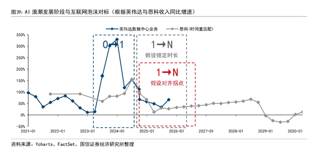 另一组对比来自专注于AI云计算的CoreWeave与当年的美国在线(AOL)。两者的营收增速对比同样显示,目前的AI产业处于应用拓展期。综合来看,这一阶段预计将持续至2026年年中。参考1998年的市场表现,“1→N”阶段通常以一次温和的市场回调结束,随后才会进入最为疯狂、泡沫化严重的“N→N+”阶段。