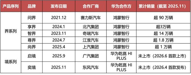 其中,鸿蒙智行模式为“五界”品牌所采用,是HI模式的升级版,也是目前华为参与度最高的合作方式。华为深度介入产品定义、设计研发与渠道销售,与合作车企形成“联合创业”的共生关系。截至2025年11月20日,鸿蒙智行全系车型累计交付量突破100万辆。