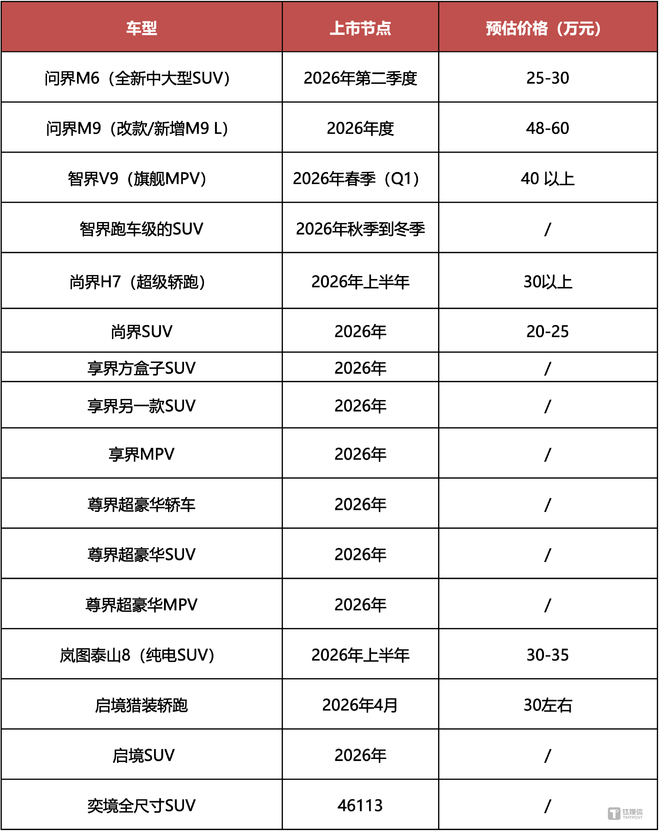 附2026年部分华为系全新车型发布计划: