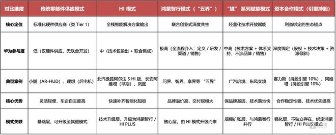 从零部件供应、HI模式,到深度共创的“界”系列、轻量赋能的“境”系列,再到资本绑定的“引望模式”, 这种多线并进的策略,就像是又一次存在在华为组织基因中的“赛马文化”的落地。