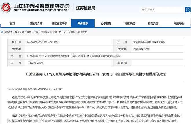 日前,江苏证监局发布关于对方正证券承销保荐有限责任公司(以下简称方正证券)、袁鸿飞、杨日盛采取出具警示函措施的决定(以下简称决定)。