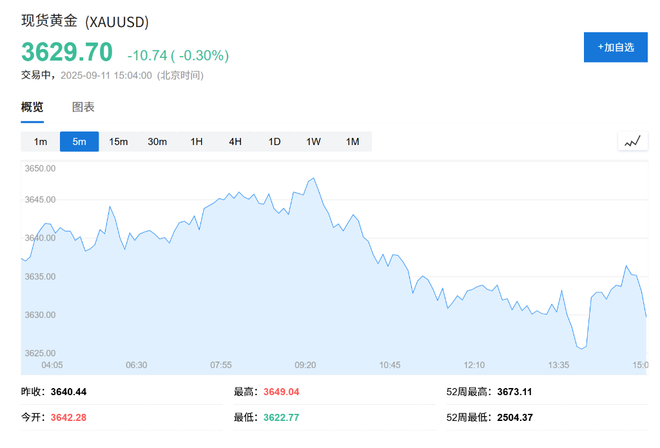 - 现货黄金下跌0.3%至3629美元/盎司。