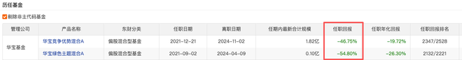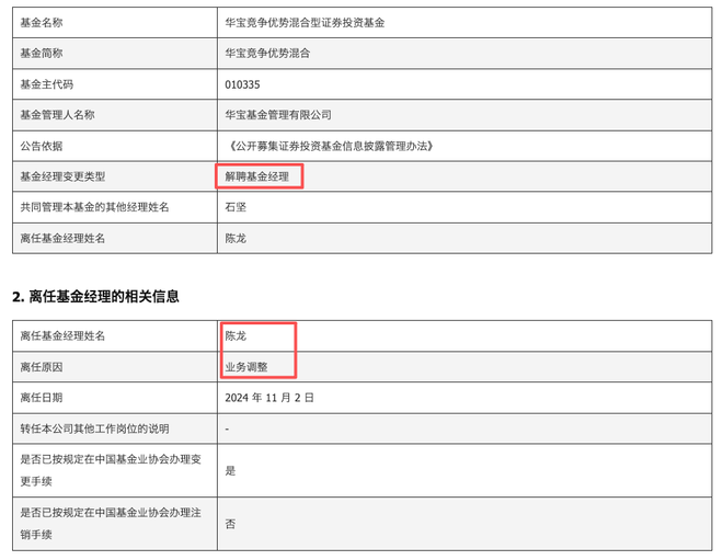 不过,陈龙在2024年4月和11月相继卸任两只产品基金经理职务。通过华宝基金当时的公告内容,2024年4月,华宝绿色主题混合基金因规模持续低于监管要求被清盘。同年11月2日,华宝竞争优势混合基金发布公告解聘陈龙,给出的离任原因为业务调整。