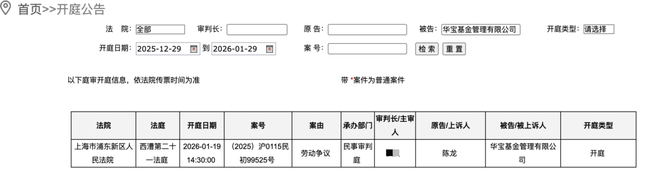 在上海市高级人民法院官网,凤凰网财经《投资观察》查询开庭信息发现,本案原告名为陈龙,案由为劳动争议,案件将于2026年1月19日开庭。