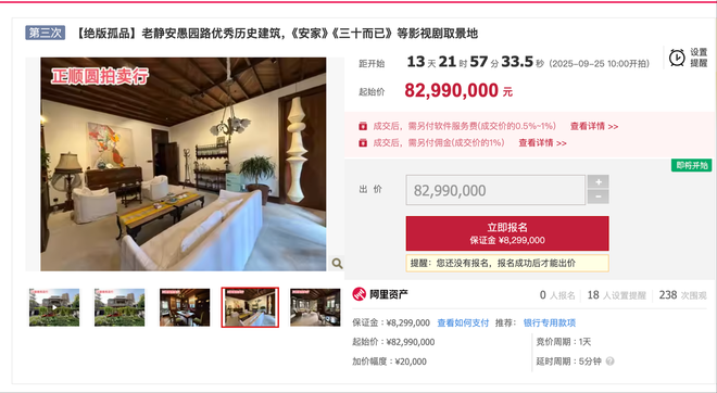 拍卖平台信息显示,这套老洋房将于9月25日开始第三次拍卖,起拍价8299万元。
