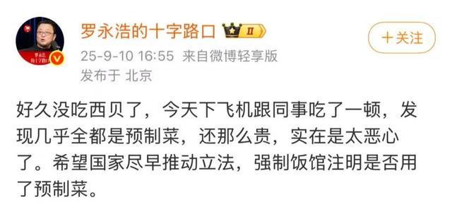 最近罗永浩在社交媒体上吐槽西贝“几乎全都是预制菜,还那么贵”,“希望国家尽早推动立法,强制饭馆注明是否用了预制菜”,一时间又把预制菜推上了舆论场的风口浪尖。