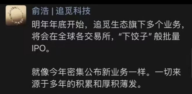 前脚刚开完年度发布会,追觅科技创始人、CEO俞浩就又在朋友圈开了"小发布会",他发布微信朋友圈表示"明年年底开始,追觅生态旗下多个业务将会在全球各交易所,"下饺子"般批量IPO。"追觅势头之迅猛,令人惊叹。