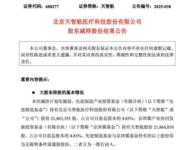 公告显示,本次减持计划实施前,先进制造基金持有天智航股份21,863,353股,占公司目前总股本的4.83%;京津冀基金持有天智航股份21,866,010股,占公司目前总股本的4.83%。先进制造基金与京津冀基金持有的以上股份均为无限售条件流通股股份,二者互为一致行动人。