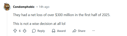 也有外国网友在新闻中关注到了智谱的亏损数字。一位叫Condomphobic的网友评论称:“2025 年上半年,该公司净亏损超过 3 亿美元。(上市)完全不是一个明智的决定。”