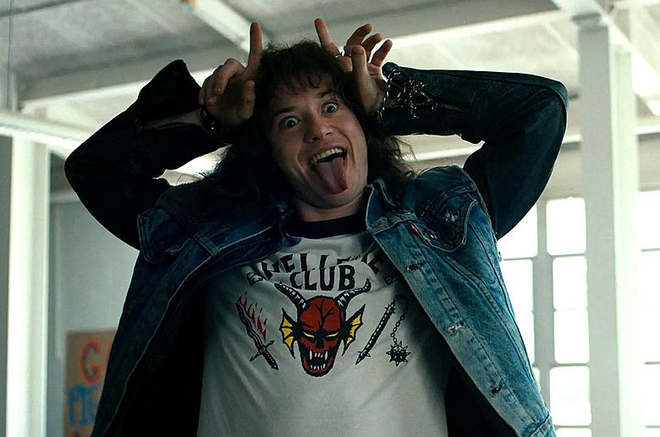 第四季的角色Eddie便是这种文化的体现。一个典型重金属爱好者的形象,他留着和ELeven非常相似的卷发,身穿俱乐部印花的插肩长袖和牛仔拼接夹克,一看就是当时校园里的刺儿头。